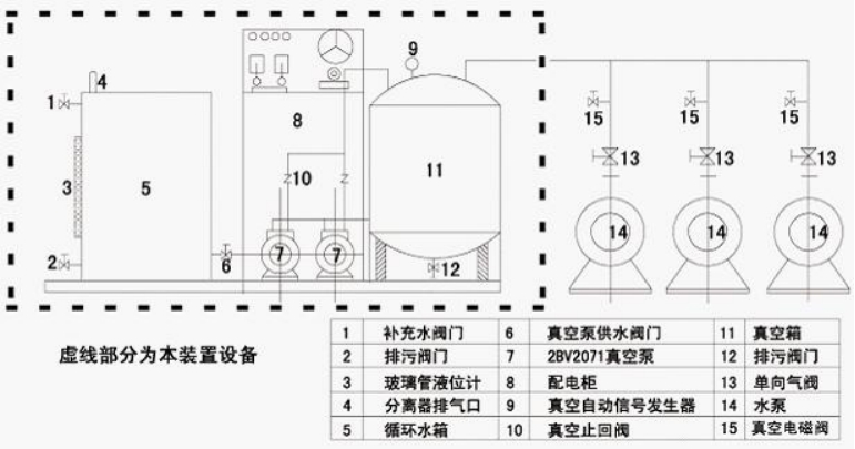 ZKYS真空引水裝置由兩臺2BV7111水環(huán)真空泵,一個真空罐,一個循環(huán)供水罐,一組管道閥件及一套電氣自動控制配電箱組成的成套的真空機組,是以真空罐作為真空存儲設(shè)備的成套系統(tǒng)。泵站內(nèi)所有水泵頂部排氣口均安裝一個單向氣閥(不在本裝置范圍之內(nèi),需要可另行訂貨),并用管道與真空罐相連。單向氣閥的作用是使?jié)B入水泵內(nèi)空氣可自由進入真空箱,而水不能通過止回閥。離心泵的開停由中央控制器通過真空管線上各自的電磁閥和流量開關(guān)控制。電磁閥處于常閉狀態(tài),當中央控制器需要啟動離心泵時,首先打開電磁閥讓離心泵與真空管線想通,當水流過流量開關(guān)時說明離心泵處于可啟動狀態(tài),中央控制器關(guān)閉電磁閥并同時啟動離心泵。真空箱上裝有自動信號發(fā)生器,真空設(shè)備根據(jù)其指令自動工作。當真空箱內(nèi)真空度低于下限時,發(fā)出停止指令真空設(shè)備自動停止。因工作液可循環(huán)使用,系統(tǒng)大大減小了工作液的消耗和對環(huán)境的污染,因此在所抽除氣體中有毒,所抽除氣體含有有機溶劑等各種場合具有明顯優(yōu)越性。在本裝置中工作液采用水作為介質(zhì)。